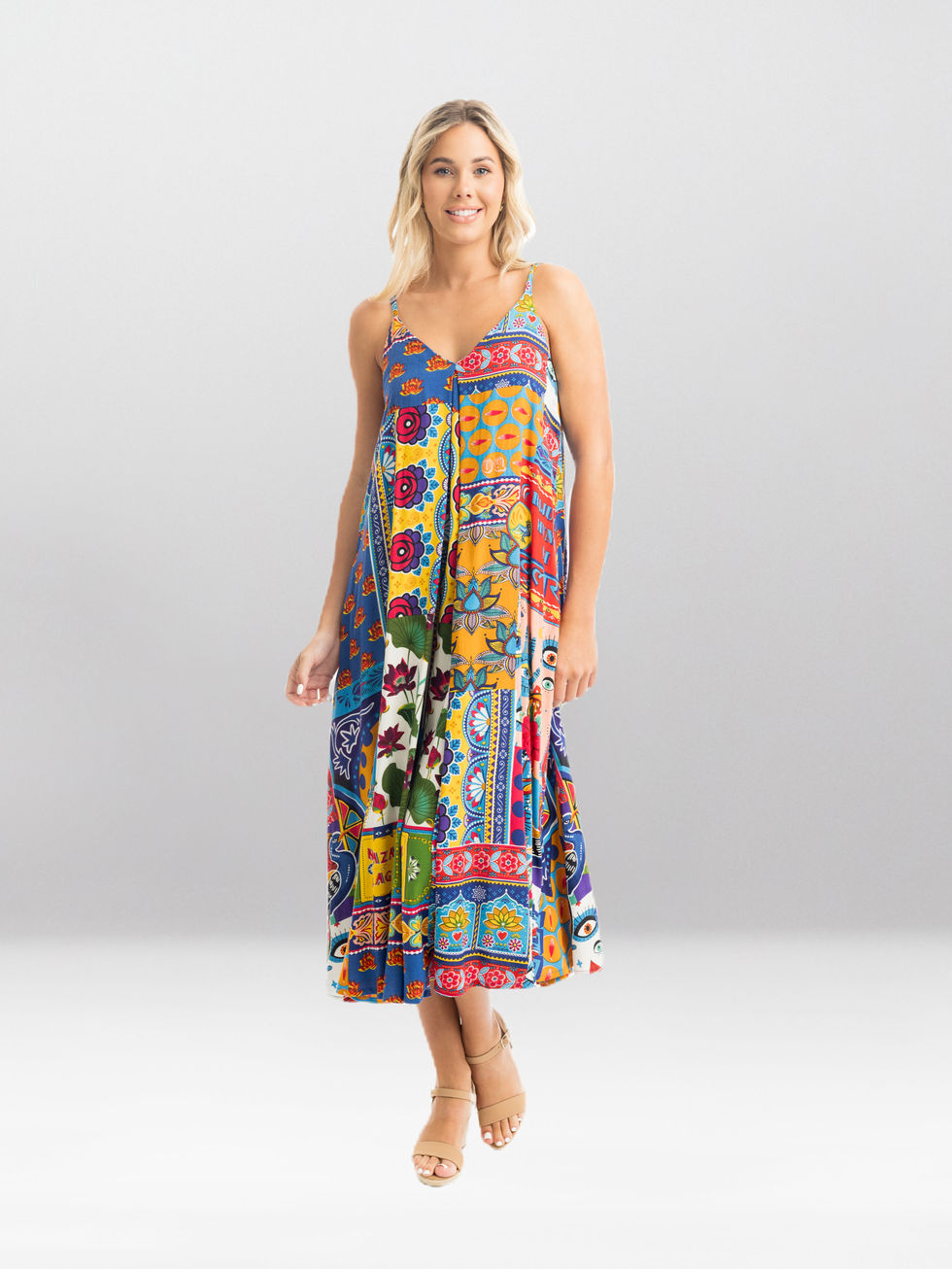 This strappy dress brings the charm of Amritsar-inspired prints to life with its graceful full-length drape. Designed for effortless wear, it features delicate shoulder straps and a flowing silhouette that moves beautifully with every step. The intricate patterns add a touch of cultural artistry, making it a standout piece for any occasion. Light and breathable, this dress offers both comfort and timeless style.